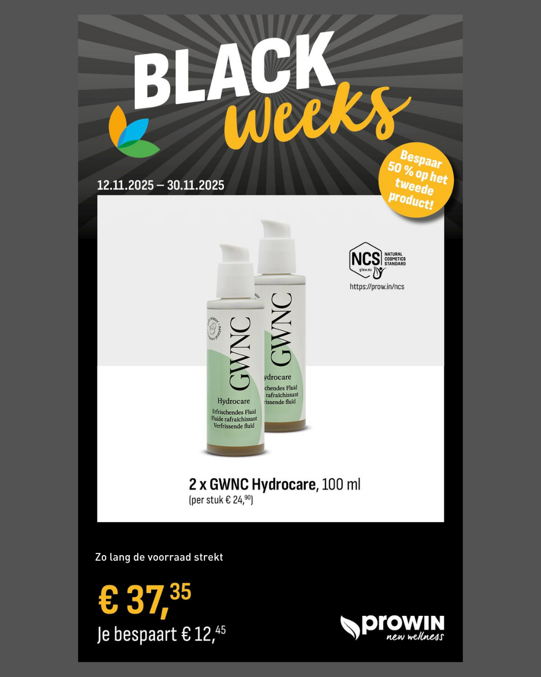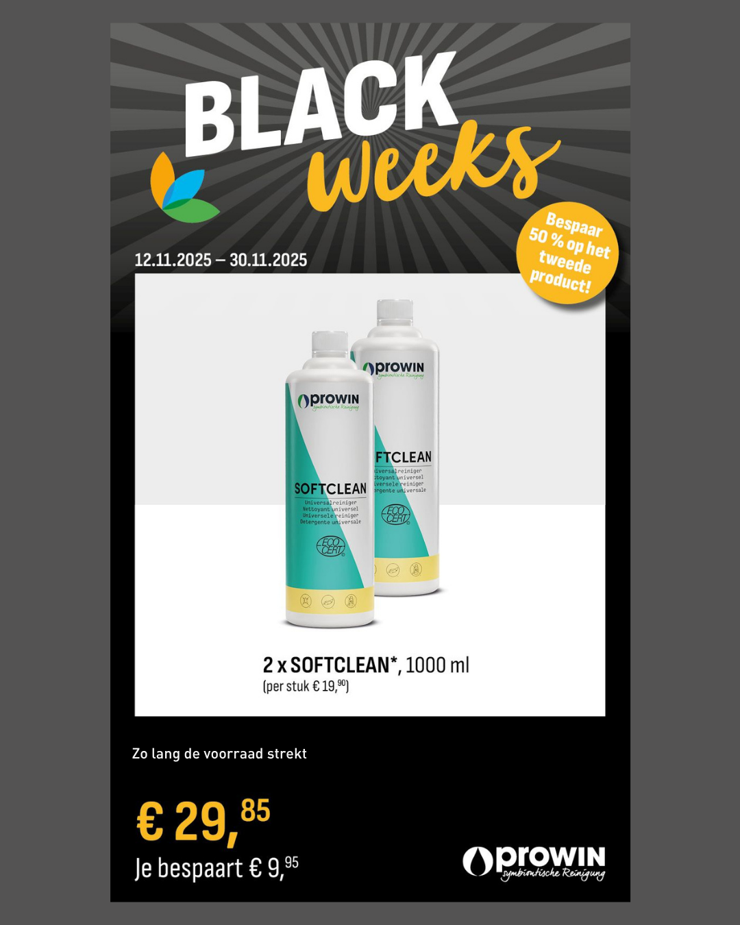 Geen Black friday bij proWIN, maar BLACK Weeks. Iedere woensdag in november 2 acties, waarbij je op het 2e product maar liefst 50% korting ontvangt.